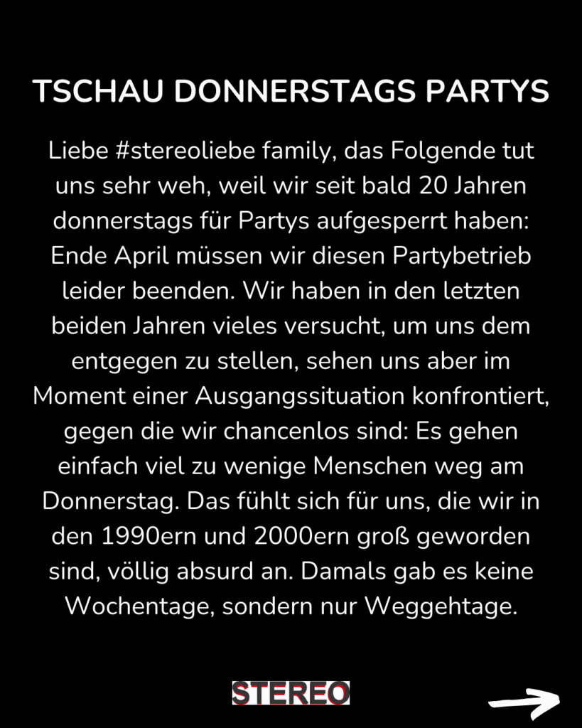 Unsere letzte Donnerstagsparty im Club Stereo. 23:00 – 05:00. Mit Haui.