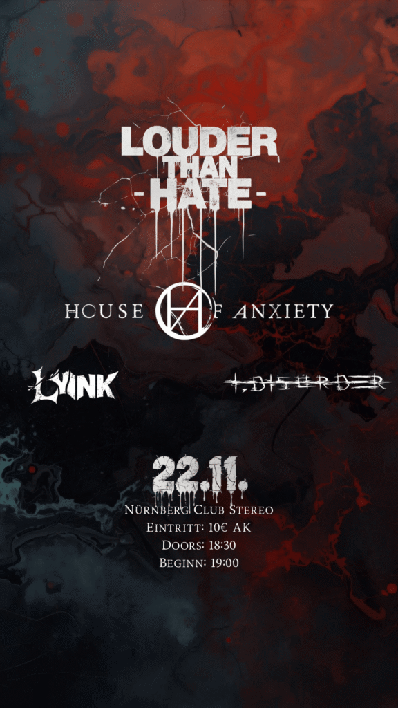 Konzert Louder than hate – Konzertabend 22.11.2025 // 19:00 Uhr Einlass: 18:30 Uhr Club Stereo Eintritt auf Spendenbasis. Live: HOUSE OF ANXIETY + I. DISORDER + LYINK Eintritt auf Spendenbasis (mindestens 10€). konzertlouderthanhate